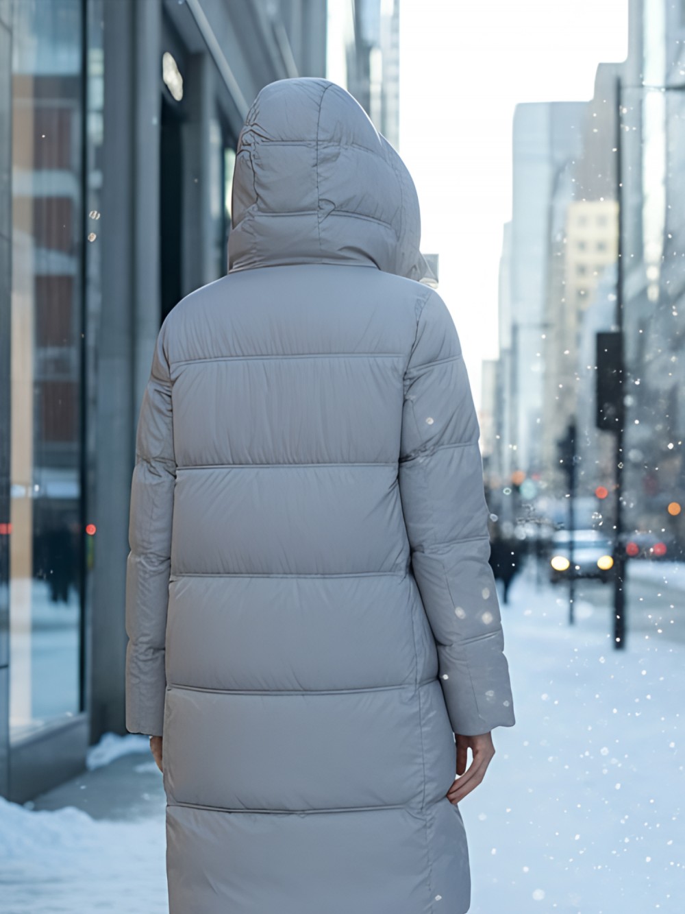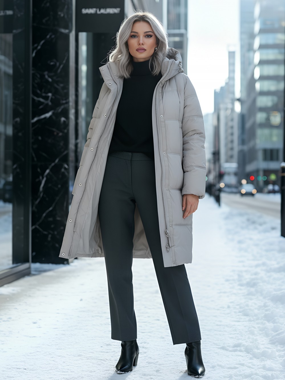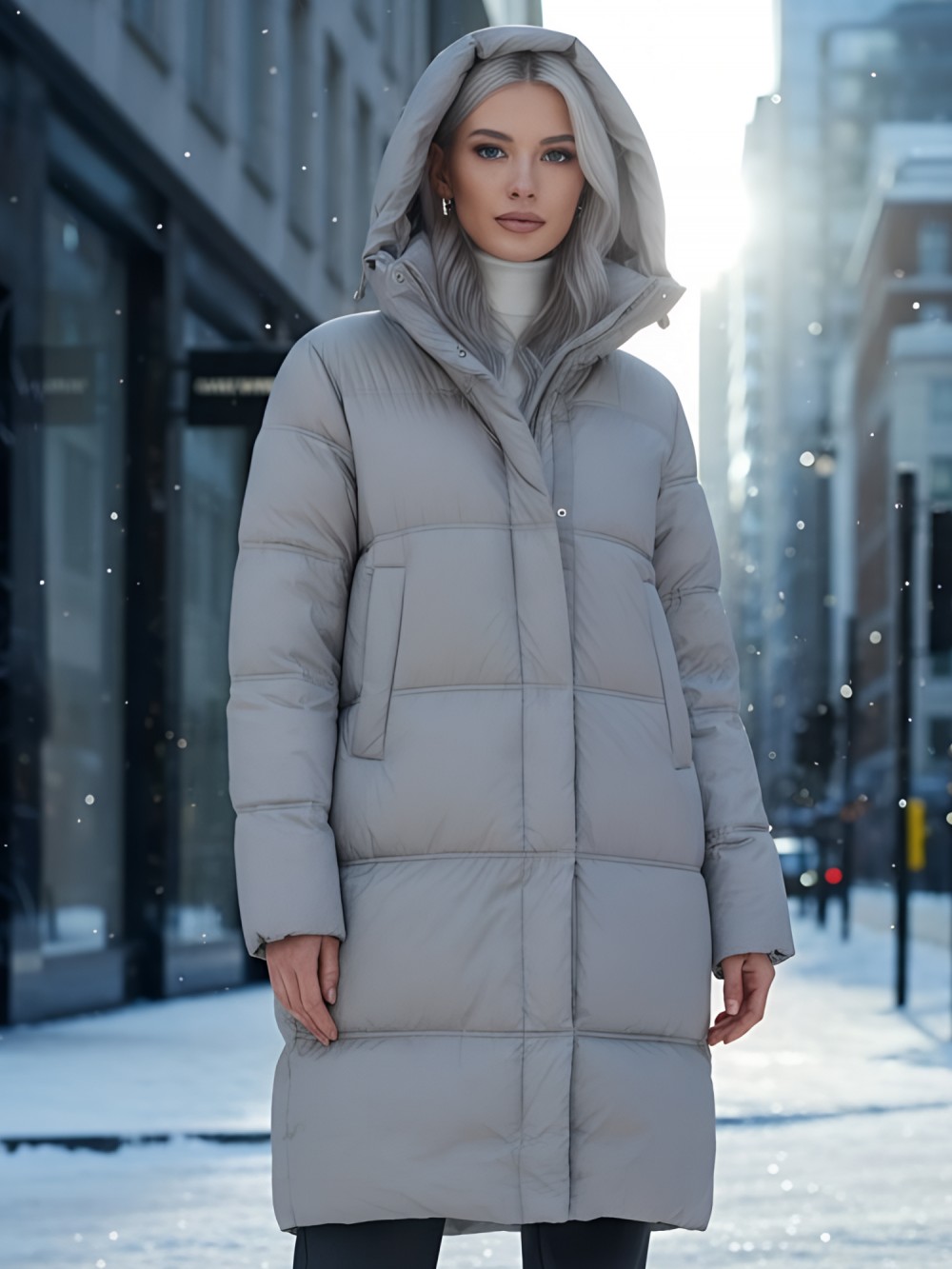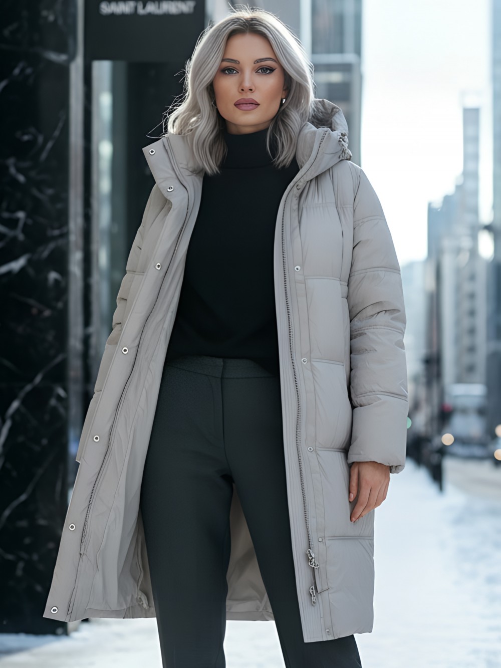 Элегантный покрой с удлиненной длиной до колена и стильным капюшоном с фиксатором придают этому пальто утонченный вид, что делает его идеальным вариантом как для офиса, так и для повседневной жизни. Внутренние карманы добавляют практичности, а двойная молния и кнопки с клапаном подчеркивают современный стиль.