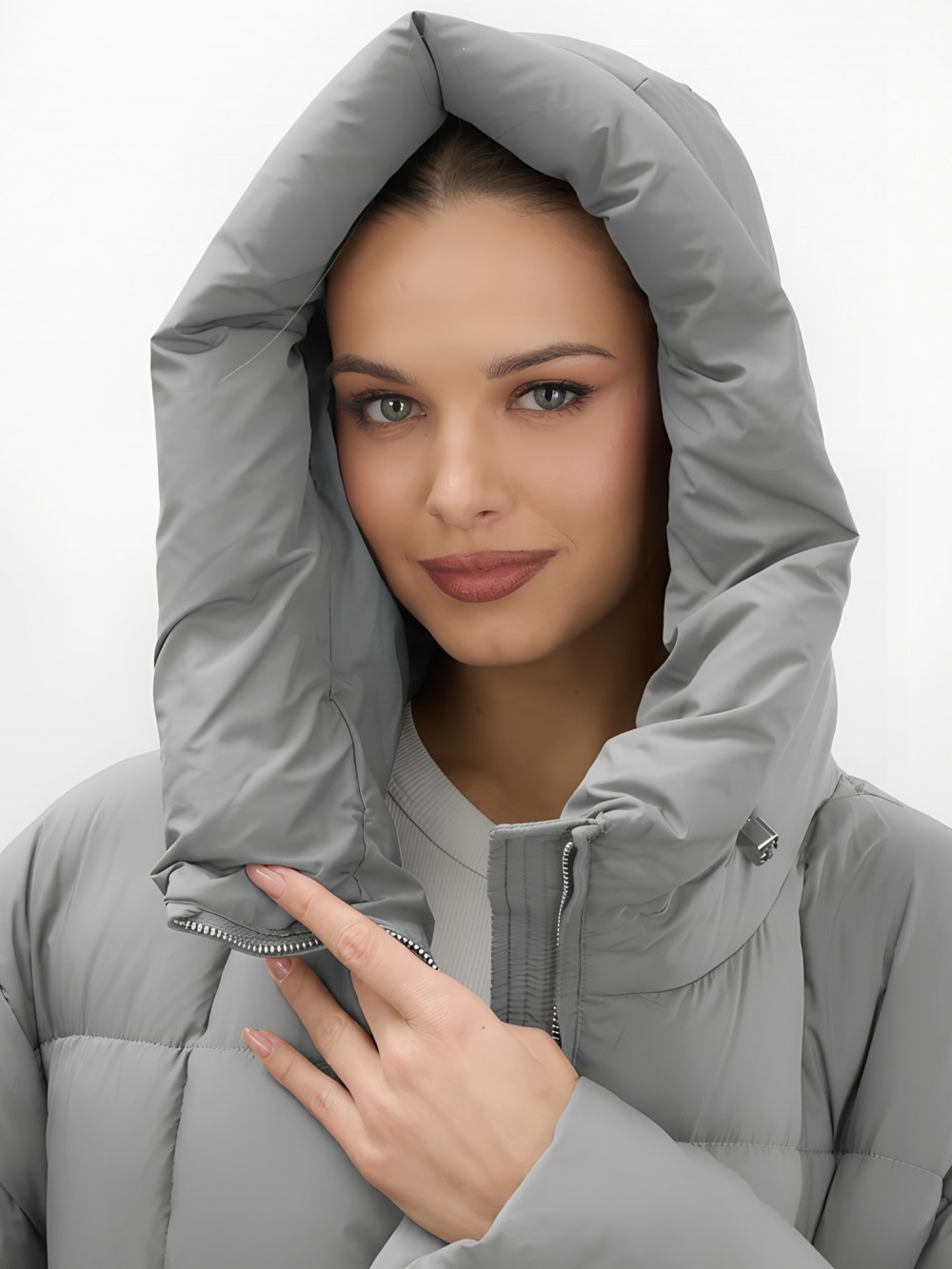 Пальто зимнее утепленное с капюшоном женское серого цвета 7741Sr